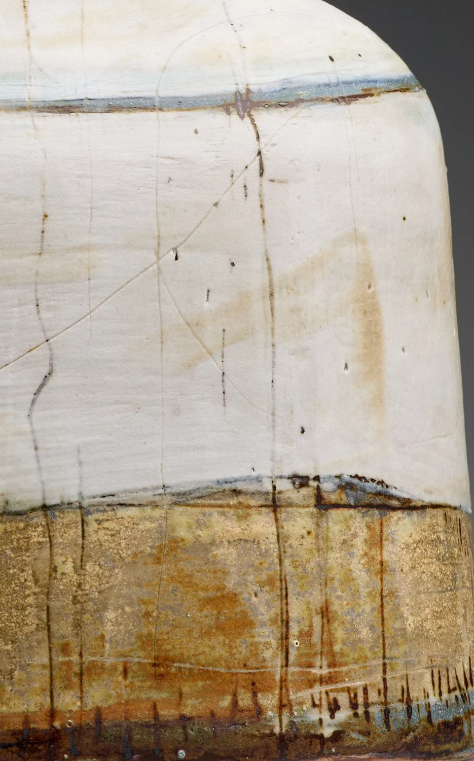 The work is thrown and altered, in porcelaneous stoneware. The surfaces are built up with slips and oxides after the line work is inlaid into the clay body. The work is high fired in reduction.